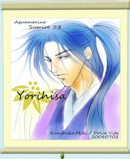 三木邦彦さま 見た瞬間、絶叫悶絶してしまった、Dolce Vita・三木様による頼久。 もう、にやけ顔が治りません。 サイト開設、じゃなくてなんと退職祝として頂戴いたしました。 頼久の和の雰囲気に合わせて掛け軸風の額に入れてみましたが、いかがかしら? 三木様、ありがとうございました!! 我が家の家宝第1号です。